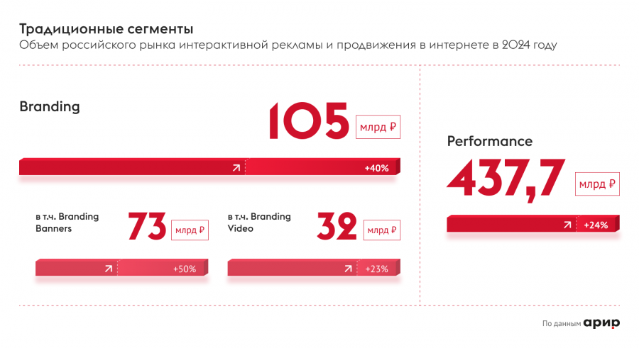 По оценкам экспертов АРИР, сегмент перформанс-рекламы продемонстрировал рост на 24% год к году, достигнув объема в 437,7 млрд руб. Инвестиции в Branding Video составили 32 млрд руб., что на 23% больше по сравнению с результатом 2023-го. Особенно заметный рост показали затраты на баннерную рекламу — расходы на нее увеличились на 50% и достигли 73 млрд руб.