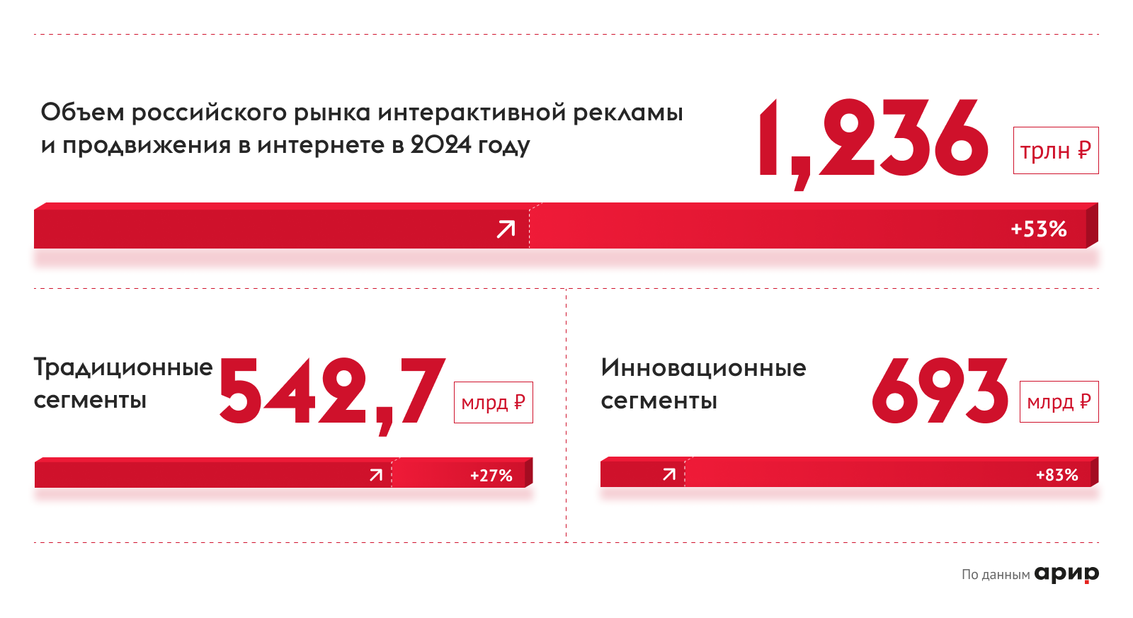 22 апреляОбъем российского рынка интерактивной рекламы и продвижения в интернете вырос на 53% год к году и составил 1,236 трлн руб. по итогам 2024-го, подсчитали в Ассоциации развития интерактивной рекламы (АРИР; результаты есть в распоряжении Sostav). Показатель впервые преодолел отметку в 1 трлн руб. Вложения в традиционные сегменты выросли на 27% и достигли 542,7 млрд руб. Инвестиции в инновационные форматы увеличились на 83%, превысив 693 млрд руб.